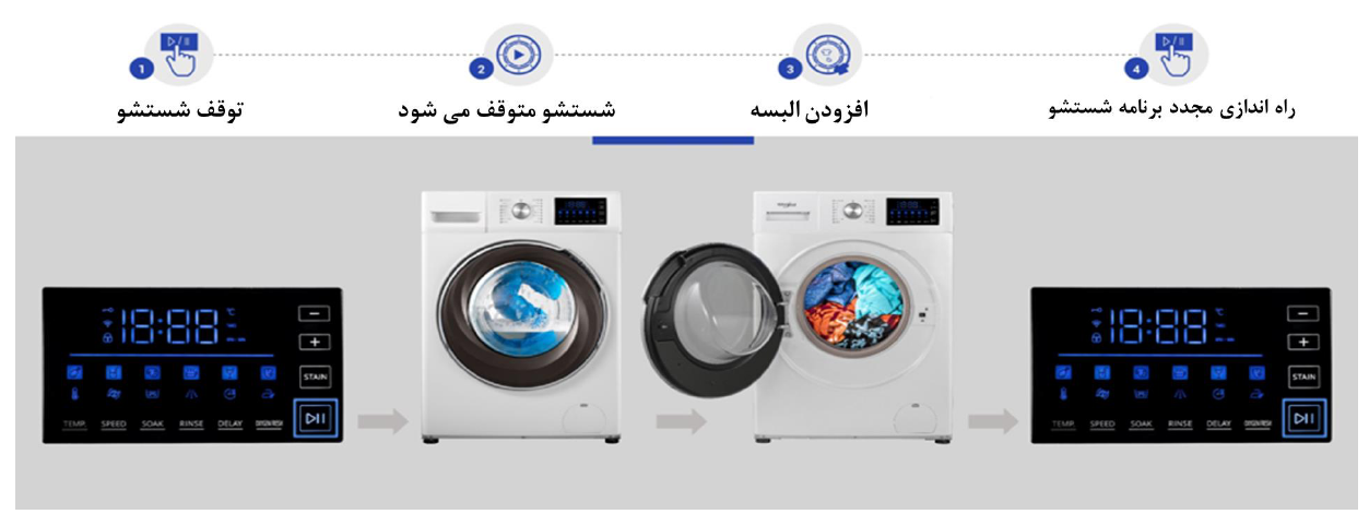 گاهی ممکن است فراموش کنید یکی از لباسها را داخل لباسشویی قرار دهید و یا لباس شما نیازی به شستشوی طولانی مدت نداشته باشد. در این شرایط میتوانید حین شستشو، مجدد لباس داخل دستگاه اضافه کنید و یا لباس مورد نظر را از داخل دیگ خارج کنید. برای استفاده از این ویژگی میتوانید برنامه را متوقف کرده، سپس لباس اضافه یا کم کنید و مجدد برنامه را راهاندازی کنید.