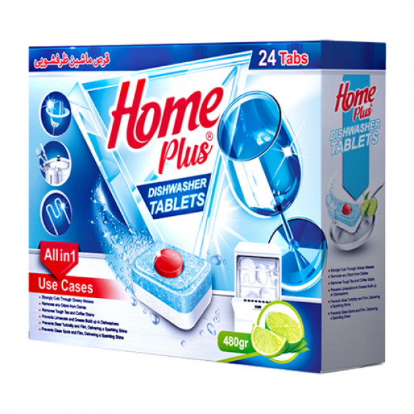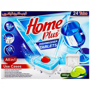 قرص ماشین ظرف‌شویی هوم پلاس 24 عددی یک قرص با قدرت است که محبوبیت زیادی دارد. این محصول با بو لیمویی که دارد رایحه ای دلپذیر به ظروف شما می‌بخشد. این قرص شوینده حاوی پلیمر ضد خش است و سریعاً در آب حل می‌شود. قرص‌های ظرف‌شویی به دلیل آنزیم‌هایی که دارند شست شو ظروف را به شکل بهتری انجام می‌دهند و لکه‌ها را با نتیجه بهتری پاک می‌کنند. همچنین به دلیل مصرف یک قرص کامل در هر بار شستشو نگرانی برای کافی بودن مواد شستشو نداریم. قرص ماشین ظرف‌شویی هوم پلاس حاوی 24 عدد قرص است و قدرت تمیزکنندگی، براق‌کنندگی، جلوگیری از رسوبات آهکی در ماشین ظرف‌شویی بالایی دارد. هر قرص مقدار شوینده مناسبی برای یک حجم کامل از ظروف را دارد. هر قرص به‌تنهایی این پوشش را دارد تا در برابر رطوبت و گرمای محیط محافظت شود. قرص ماشین ظرف‌شویی از آنزیم‌های مختلفی برخوردار بوده که می‌تواند ظروف را تمیز و شفاف کند و این نوع شوینده‌ها در رایحه‌های متنوعی نیز تولید می‌شوند که علاوه بر براقی و جلا دادن به ظروفتان آن‌ها را خوشبو نیز می‌کنند.